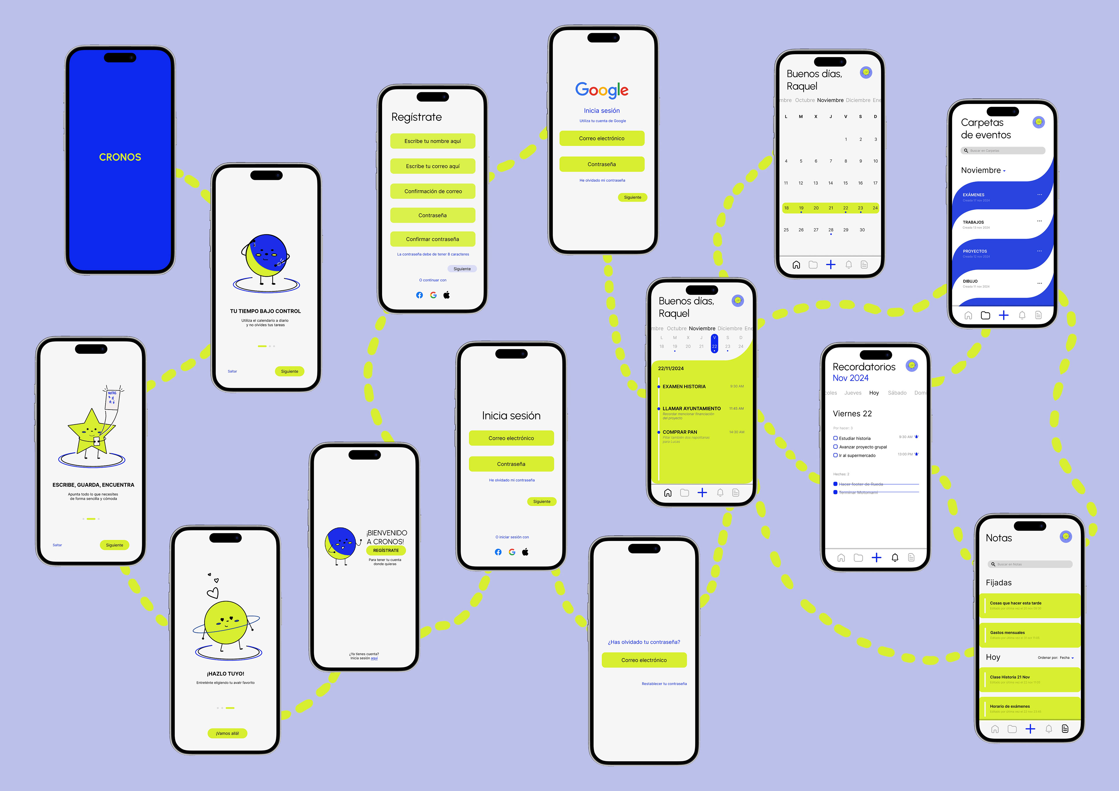 Cronos es un proyecto de diseño de una aplicación de organización planteado desde un enfoque innovador, que se aleja del estilo serio y neutro característico de muchas apps de este tipo. Mediante una paleta cromática vibrante, asociada a la energía y al dinamismo, el proyecto pretende incentivar al usuario y transformar la organización en una experiencia activa y motivadora. La propuesta busca centralizar en un único entorno todos los elementos clave del día a día, como tareas y recordatorios, presentados de manera clara, intuitiva y visualmente atractiva.